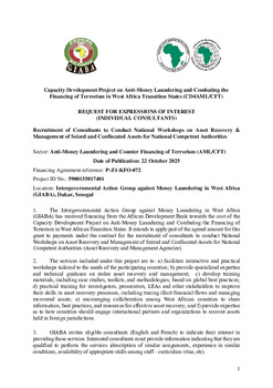 Recruitment of Consultants to Conduct National Workshops on Asset Recovery & Management of Seized and Confiscated Assets for National Competent Authorities |