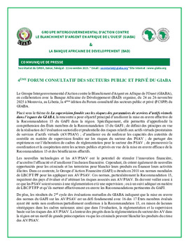 Le Groupe Intergouvernemental d'Action contre le Blanchiment d'Argent en Afrique de l'Ouest (GIABA), en collaboration avec la Banque Africaine de Développement (BAD) organise, du 24 au 26 novembre 2025 à Monrovia, au Liberia, la 4ème édition du Forum consultatif des secteurs public et privé (FCSPP) du GIABA.