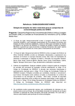A GIABA convida as estações de rádio e televisão interessadas dos seguintes Estados: Benim, Cabo Verde, Costa do Marfim, Gâmbia, Gana, Guiné, Guiné-Bissau, Libéria, Nigéria, Senegal, Serra Leoa e Togo a expressarem seu interesse em fornecer os serviços descritos acima.