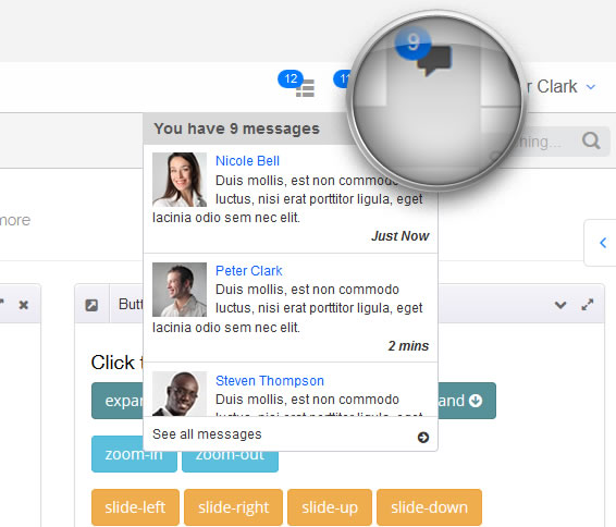 <!-- start: HEADER --> <div class="navbar navbar-inverse navbar-fixed-top"> <!-- start: TOP NAVIGATION CONTAINER --> <div class="container"> <div class="navbar-header"> <!-- start: RESPONSIVE MENU TOGGLER --> <button data-target=".navbar-collapse" data-toggle="collapse" class="navbar-toggle" type="button"> <span class="clip-list-2"></span> </button> <!-- end: RESPONSIVE MENU TOGGLER --> <!-- start: LOGO --> <a class="navbar-brand" href="index.html"> CLIP<i class="clip-clip"></i>ONE </a> <!-- end: LOGO --> </div> <div class="navbar-tools"> <!-- start: TOP NAVIGATION MENU --> <ul class="nav navbar-right"> <!-- start: TO-DO DROPDOWN --> <li class="dropdown"> <a data-toggle="dropdown" class="dropdown-toggle" href="#"> <i class="clip-list-5"></i> <span class="badge"> 12</span> </a> <ul class="dropdown-menu todo"> <li> <span class="dropdown-menu-title"> You have 12 pending tasks</span> </li> <li> <div class="drop-down-wrapper"> <ul> <li> <a class="todo-actions" href="javascript:void(0)"> <i class="icon-check-empty"></i> <span class="desc" style="opacity: 1; text-decoration: none;">Staff Meeting</span> <span class="label label-danger" style="opacity: 1;"> today</span> </a> </li> <li> <a class="todo-actions" href="javascript:void(0)"> <i class="icon-check-empty"></i> <span class="desc" style="opacity: 1; text-decoration: none;"> New frontend layout</span> <span class="label label-danger" style="opacity: 1;"> today</span> </a> </li> <li> <a class="todo-actions" href="javascript:void(0)"> <i class="icon-check-empty"></i> <span class="desc"> Hire developers</span> <span class="label label-warning"> tommorow</span> </a> </li> <li> <a class="todo-actions" href="javascript:void(0)"> <i class="icon-check-empty"></i> <span class="desc">Staff Meeting</span> <span class="label label-warning"> tommorow</span> </a> </li> <li> <a class="todo-actions" href="javascript:void(0)"> <i class="icon-check-empty"></i> <span class="desc"> New frontend layout</span> <span class="label label-success"> this week</span> </a> </li> <li> <a class="todo-actions" href="javascript:void(0)"> <i class="icon-check-empty"></i> <span class="desc"> Hire developers</span> <span class="label label-success"> this week</span> </a> </li> <li> <a class="todo-actions" href="javascript:void(0)"> <i class="icon-check-empty"></i> <span class="desc"> New frontend layout</span> <span class="label label-info"> this month</span> </a> </li> <li> <a class="todo-actions" href="javascript:void(0)"> <i class="icon-check-empty"></i> <span class="desc"> Hire developers</span> <span class="label label-info"> this month</span> </a> </li> <li> <a class="todo-actions" href="javascript:void(0)"> <i class="icon-check-empty"></i> <span class="desc" style="opacity: 1; text-decoration: none;">Staff Meeting</span> <span class="label label-danger" style="opacity: 1;"> today</span> </a> </li> <li> <a class="todo-actions" href="javascript:void(0)"> <i class="icon-check-empty"></i> <span class="desc" style="opacity: 1; text-decoration: none;"> New frontend layout</span> <span class="label label-danger" style="opacity: 1;"> today</span> </a> </li> <li> <a class="todo-actions" href="javascript:void(0)"> <i class="icon-check-empty"></i> <span class="desc"> Hire developers</span> <span class="label label-warning"> tommorow</span> </a> </li> </ul> </div> </li> <li class="view-all"> <a href="javascript:void(0)"> See all tasks <i class="icon-circle-arrow-right"></i> </a> </li> </ul> </li> <!-- end: TO-DO DROPDOWN--> <!-- start: NOTIFICATION DROPDOWN --> <li class="dropdown"> <a data-toggle="dropdown" data-hover="dropdown" class="dropdown-toggle" data-close-others="true" href="#"> <i class="clip-notification-2"></i> <span class="badge"> 11</span> </a> <ul class="dropdown-menu notifications"> <li> <span class="dropdown-menu-title"> You have 11 notifications</span> </li> <li> <div class="drop-down-wrapper"> <ul> <li> <a href="javascript:void(0)"> <span class="label label-primary"><i class="icon-user"></i></span> <span class="message"> New user registration</span> <span class="time"> 1 min</span> </a> </li> <li> <a href="javascript:void(0)"> <span class="label label-success"><i class="icon-comment"></i></span> <span class="message"> New comment</span> <span class="time"> 7 min</span> </a> </li> <li> <a href="javascript:void(0)"> <span class="label label-success"><i class="icon-comment"></i></span> <span class="message"> New comment</span> <span class="time"> 8 min</span> </a> </li> <li> <a href="javascript:void(0)"> <span class="label label-success"><i class="icon-comment"></i></span> <span class="message"> New comment</span> <span class="time"> 16 min</span> </a> </li> <li> <a href="javascript:void(0)"> <span class="label label-primary"><i class="icon-user"></i></span> <span class="message"> New user registration</span> <span class="time"> 36 min</span> </a> </li> <li> <a href="javascript:void(0)"> <span class="label label-warning"><i class="icon-shopping-cart"></i></span> <span class="message"> 2 items sold</span> <span class="time"> 1 hour</span> </a> </li> <li class="warning"> <a href="javascript:void(0)"> <span class="label label-danger"><i class="icon-user"></i></span> <span class="message"> User deleted account</span> <span class="time"> 2 hour</span> </a> </li> <li class="warning"> <a href="javascript:void(0)"> <span class="label label-danger"><i class="icon-shopping-cart"></i></span> <span class="message"> Transaction was canceled</span> <span class="time"> 6 hour</span> </a> </li> <li> <a href="javascript:void(0)"> <span class="label label-success"><i class="icon-comment"></i></span> <span class="message"> New comment</span> <span class="time"> yesterday</span> </a> </li> <li> <a href="javascript:void(0)"> <span class="label label-primary"><i class="icon-user"></i></span> <span class="message"> New user registration</span> <span class="time"> yesterday</span> </a> </li> <li> <a href="javascript:void(0)"> <span class="label label-primary"><i class="icon-user"></i></spa